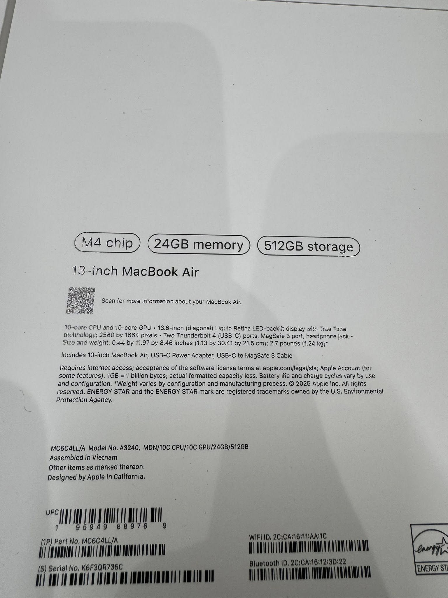 MC6C4LL/A Macbook Air – M4 Chip 10 core CPU – 10 Core GPU, 24GB RAM, 512GB SSD, 13.6” Liquid Retina Display